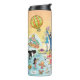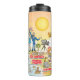 Une scène lumineuse et colorée offre une vue spectaculaire de la Californie du Sud - personnages farfelus sur la plage et le désert de SoCal présentant les parcs de Los Angeles, Orange County, San Diego, Père Noël Barbara, Riverside, Palm Springs, El Centro, Salton Sea, Anza Borrego et Joshua Tree ainsi que les villes frontalières de Tijuana, Tecate et Mexicali. Cette charmante scène a tout - un surfeur pend dix tandis qu'un orque saute de l'eau, des animaux de zoo accueillent les touristes, les amateurs de vin font un toast comme un randonneur est scanné par un OVNI et bien plus encore...