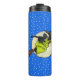 Cette bouteille thermo-tumbler pour garder vos boissons froides ou chaudes a une sorcière avec un chat noir sur le dos volant sur un balai portant une robe verte au-delà d'une pleine lune jaune et étoiles dans un ciel bleu nuit.