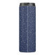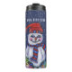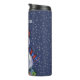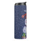 Cette bouteille thermo-tondeuse pour garder vos boissons froides ou chaudes est bleu foncé avec des flocons de neige en chute et un bonhomme de neige souriant portant un casquette d'hiver et une écharpe tenant un cordon brillant de lumières de Noël éclairées. Customisez votre texte avec le modèle.