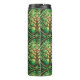 Tall stainless steel travel mug with intricate green and brown leafy mandala pattern, viewed from two angles. Elegant and earthy design.