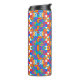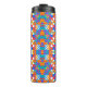 Tall travel mug with a vivid geometric pattern. The design features colorful shapes and abstract flowers in bright orange, blue, pink, and green tones.