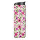 Tall tumbler with floral pattern, featuring vibrant pink and purple flowers and green leaves on a white background. Black lid tops the elegant design.