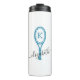 Turquoise et blanc Travel Mug avec un turquoise bleu et blanc Tennis Racket Monogram Design Personnalisé avec votre initiale et votre nom dans une police de script élégante. Changez les polices et les couleurs pour concevoir votre propre joueur d'équipe de tennis tasse de café thermique personnalisée en cliquant sur 'customiser plus loin' sous la zone de personnalisation.