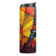 Ce magnifique graphisme présente la Tour Eiffel dans un style vitrail abstrait et vibrant. Des taches cintrées de rouge, jaune, turquoise et violet créent un effet de mosaïque captivant autour de la silhouette noire iconique. Cette interprétation artistique capte l'essence de Paris avec une touche unique et colorée.