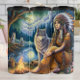 Une femme amérindienne contemplative, ornée d'une coiffeuse en plumes vibrante et d'une tenue traditionnelle à franges, est assise au bord d'un feu de camp qui craque au bord d'un lac tranquille. Un loup gris loyal se tient protectivement à côté d'elle, tandis que d'autres loups se cachent dans la forêt éclairée par la lune, créant une scène sauvage sereine et mystique sous une lune pleine et brillante.