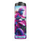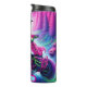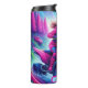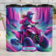 Un VTT dynamique et stylisé, vêtu d'un équipement rose et bleu assorti, navigue sur un parcours hors route surréaliste. Tout le paysage éclate de couleurs éblouissantes de rose, de violet, de bleu et de vert, transformant la forêt et les montagnes en un paysage de rêve psychédélique. D'autres véhicules sont à peine visibles, ajoutant de la profondeur à cette scène d'aventure énergique et aux couleurs fantastiques.
