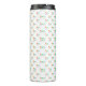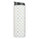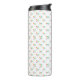 "White travel mug with black lid featuring a colorful, repetitive abstract pattern of triangles and lines in red, blue, green, and yellow. The pattern creates a vibrant and playful tone."