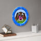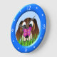 Chien et Papillon beagle - BEBY100 © Sunny Mars Designs. Cette adorable horloge murale circulaire de grande taille pour enfants personnalisés présente un dessin animé vectoriel d'un mignon chien beagle brun avec un joli papillon rose assis sur son nez pendant qu'il le regarde, avec un anneau bleu autour. Un cadeau parfait pour les enfants.