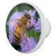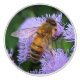 Ce bouton de porte en céramique animal comporte un or et une abeille noire de miel pollinisant les fleurs violettes pourpres pâles d'un plante d'ageratum.