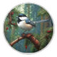 Une mignonne poule noire (Poecile atricapillus) se trouve sur une branche de conifères dans une forêt légèrement brumeuse. On trouve le poulet à capuchon noir dans toute l'Amérique du Nord, du nord des États-Unis au sud du Canada et jusqu'en Alaska et au Yukon. Les poulets sont des oiseaux actifs et vivants, connus pour leur appel à la poussette à l'acte qui a l'air enjoué. Ils se nourrissent principalement d'insectes et de graines et sont connus pour leur capacité à mettre la nourriture en cache afin de survivre à de longs hivers froids. L'hippocampe d'un poulet s'étend d'environ 30 % à l'automne et conserve son volume pendant l'hiver, ce qui permet à l'oiseau de se souvenir où il a planté de la nourriture. Au printemps, la mémoire de l'endroit où ces bouts de nourriture étaient cachés disparaît et la taille de l'hippocampe retourne à son volume de pré-mise en cache.