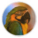 Ce beau bouton en céramique présente un perroquet de macaw. Copyright : Marjorie Tietjen