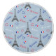 Seamless Paris text illustration with Eiffel Tower, tricolor heart shapes and French flag decoration on blue background for Valentine's Day