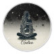 Une silhouette enchanteresse d'une femme bercée par une boule de cristal brillante, symbolisant émerveillement et introspection. La toile de fond est ornée d'un luxueux bokeh noir et or aux lumières douces et chatoyantes et aux étincelles célestes, évoquant une atmosphère onirique.