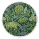 Seamless William Morris style wallpaper pattern featuring dense green foliage and large, rounded flowers in shades of lime green, off-white, and muted lavender against a dark emerald background.