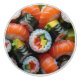 A kitchen cabinet knob with a realistic picture of a plate of avocado sushi.