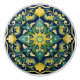 Le bouton en céramique est une oeuvre d'art captivante. Son arrière - plan bleu foncé sert de toile frappante, offrant un contraste spectaculaire avec le motif symétrique fleuri jaune et vert vif. La teinte riche et profonde du bleu évoque un sentiment de mystère et de profondeur, créant une base visuellement convaincante pour le design complexe. Le motif floral jaune et vert est minutieusement travaillé, chaque pétale et chaque feuille affichant un niveau de détail remarquable. Les jaunes sont lumineux et animés, dégageant une énergie chaude et joyeuse. Ils se démarquent audacieusement contre l'arrière - plan plus sombre, attirant l'oeil et suscitant l'attention. Les éléments verts complètent magnifiquement le jaune, offrant une touche rafraîchissante et naturelle. Ils évoquent un sentiment de croissance et de vitalité, entrelacant les teintes dorées pour créer une symphonie harmonieuse de couleurs. La symétrie du motif floral ajoute un sens de l'équilibre et de l'ordre, ce qui augmente l'impact visuel global. Ce bouton en céramique représente une fusion d'art et d'artisanat, mettant en valeur l'habileté et la créativité de l'artisan qui a minutieusement peint chaque élément à la main. C'est un témoignage de la tradition persistante de l'azulejos, où chaque pièce raconte une histoire à travers ses couleurs et ses motifs, laissant une impression durable sur ceux qui ont la chance de voir sa beauté.