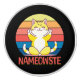 Illustration colorée avec la conception de texte "Nameowste" et chatte Kawaii mignon fait du yoga sur un arrière - plan rétro rayé coloré
