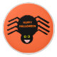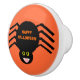 Ce superbe bouton en céramique présente une araignée noire éffrayante avec huit pattes poilues, des yeux jaunes avec de grands élèves noirs et sa bouche ouverte montrant ses crocs. Il y a un texte orange qui dit "Happy Halloween" et un arrière - plan orange correspondant.