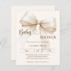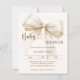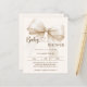 A soft beige, cream background, decorated with a large bow. Gender neutral. Personalize and add a name and party details.