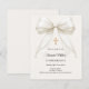 Celebrate your daughter's milestone with this elegant Confirmation invitation. This design features a stunning, oversized ivory silk bow adorned with delicate pearl strands and a central ornate gold cross. It is the perfect choice for a traditional Catholic ceremony or a sophisticated religious celebration for a young girl.