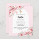 Un cadre d'arc blanc et un arrière - plan de pinte légère. Décoré de fleurs roses et arcs à épingles. Une croix d'or. Personnalisez et ajoutez un nom et des détails. I feuille = 1 invitation imprimé bord à bord.
