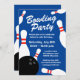Modèle d'invitation à la fête d'anniversaire de bowling moderne. invitations cool avec boules de bowling noires et épingles de bowling blanc. Personnalisez avec votre nom et votre texte. Animation amusante pour petits et grands. Arrière - plan de couleur bleu ou personnalisé. Amusons-nous un peu !