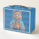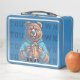 Boîte à déjeuner personnalisée pour les enfants avec un design moderne d'un ours athlétique tenant un football. Parfait pour les garçons qui aiment le football. Customisez le texte à l'avant et à l'arrière de la boîte à lunch. Ajoutez le nom souhaité. Montré en bleu. Utilisez le modèle pour créer votre propre boîte à lunch personnalisée pour les enfants.