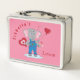 Une mignonne lunchbox rose et blanc pour les enfants avec un mignon éléphant de bande dessinée tenant la fleur et entouré de quelques coeurs rouges et roses. © ArianeC Illustrations-Tous droits réservés