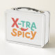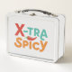 Cette boîte à lunch attrayante conçoit l'expression "X-tra Spicy" dans une explosion multicolore enflammée. Chaque lettre éclate avec une teinte vibrante différente, comme des flammes léchant à travers le tissu. Le design est parfait pour les enfants pour quelqu'un qui adopte une personnalité audacieuse et épicée, ou peut-être aime-t-il une bonne aide de sauce chaude !