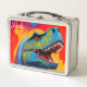 Une boîte à lunch métallique colorée avec un graphique de T-Rex vibrant, personnalisée avec un nom personnalisé.