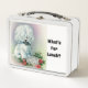Sweet, photo vintage d'un mignon petit blanc avec un plat demande, "What's For Lunch" ?, est présenté sur le devant de la lunchbox en métal blanc, le dos dit, "Tina's Lunch Box", qui peut être personnalisée avec le nom de l'enfant ou le texte de votre choix. Un excellent moyen d'aller déjeuner à l'école dans un design unique!