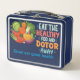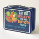 La conception de la boîte à lunch comprend l'expression ludique "Mange la nourriture saine et le médecin loin" dans une police dynamique et multicolore. L'arrière - plan présente une scène colorée et ludique de divers légumes caricaturaux, le tout souriant et arrangé de manière amusante et fantaisiste. La conception favorise des habitudes alimentaires saines et encourage les enfants à profiter de leurs repas tout en restant en santé.