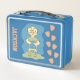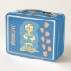 Boîte à lunch bleu clair neutre pour les femmes avec un adorable canard jaune portant de grandes lunettes et tenant un livre. Les empreintes de canard orange sont affichées à droite. Personnalisez-le avec le nom de l'enfant en utilisant le modèle. © ArianeC Illustrations-Tous droits réservés