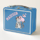 Une mignonne boîte à lunch bleue pour les enfants (garçons ou filles) avec un chat tabby gris et noir envoyant des câlins et des baisers. Utilisez le modèle pour le personnaliser avec le nom de votre enfant. N'hésitez pas à modifier la couleur de la police ou de la police elle-même si vous le souhaitez. © ArianeC Illustrations