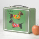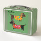 Boîte à déjeuner mignonne avec chiots Dachshund photo, et un nom qui peut facilement être changé. Merci à Creative Fabrica pour certains des éléments du design. La lunchbox est verte, un chien est brun, l'autre noir et ils portent tous deux des vêtements pointillés.