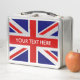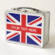 Les Union Jack britanniques drapeau vieille boîte à lunch en métal de l'école avec nom personnalisé ou monogramme. Boîte à déjeuner de style rétro avec drapeau anglais et texte personnalisé. Idées cadeaux d'anniversaire ou de Noël personnalisées pour les hommes, les femmes et les enfants. Boîte à lunch métallique brillante vintage avec poignée. Cool présent pour le conjoint, l'enseignant de jardin d'enfants, les enfants de l'école, l'étudiant, le travailleur de bureau, le mari, le patron, le collègue, l'ami, l'infirmière, le travailleur de la construction, le personnel, l'employé, les enfants, garçon, fille, petit-fils, père etc. Ajoutez votre propre nom, des initiales monogrammes ou une citation drôle. Royaume-Uni GB Grande-Bretagne fierté. Aussi agréable comme boîte de conservation après mariage ou anniversaire.