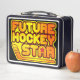 Épinglette En Métal De Hockey Sur Glace. Ajoutez votre propre nom et numéro à la boîte à lunch pour faire une grande boîte personnalisée, pour l'école, l'université, le bureau ou les voyages! Il suffit d'utiliser les zones de texte situées à droite de l'image. Design de texte en gras dans les tons orange, jaune et rouge avec le texte FUTURE HOCKEY STAR et une conception de bâton de hockey.