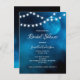Une carte d'invitation romantique pour une douche nuptiale rustique. Une soirée et une nuit bleu foncé avec une pleine lune et des lumières à cordes. Modèles pour les détails de date, nom, lieu de l'événement et RSVP. Le nom est écrit avec un script de style moderne écrit à la main. Lettres blanches. Retour : un ciel bleu foncé. La carte est également disponible dans notre magasin avec un arrière - plan blanc sur le dos. Conseil : Si vous ne voulez pas qu'il ressemble à une carte postale, cliquez sur customiser, allez à l'arrière et retirez le séparateur et le timbre postal.