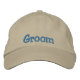 Assurez-vous que tout le monde sait que vous êtes le marié ! Great casquette a le mot GROOM brodé sur le devant en bleu. Idéal pour les fêtes de baccalauréat, les répétitions mariages et tous les événements auxquels les mariés doivent assister ! Offrez à nos "groomsman", "usher" et autres casquettes de mariage des cadeaux à toute votre fête de mariage !