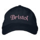 Broderie personnalisée sur votre choix de couleur et de style casquette de baseball. Montré est le nom modifiable, Bristol, brodé en écriture rose féminine sur un casquette/casquette de baseball bleu marine de baseball. Autres couleurs et styles de texte brodés disponibles. Conçu par 369MyName.