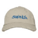 Casquette de natation avec logo bleu sur l'avant et fait avec crâne, nageoires roses et lunettes sur le fond arrière.