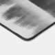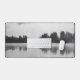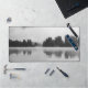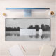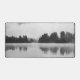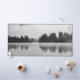Photo du paysage du brouillard matinal au-dessus du lac et des arbres autour du rivage en noir et blanc.