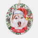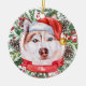 Cet ornement de Noël en céramique sophistiqué présente une aquarelle d'un beau Husky à la fourrure brune et blanche dans un chapeau de Père Noël, entouré de verdure de vacances, de pinecones et de baies, avec une bannière rouge avec le nom de votre animal (ou changer pour Joyeux Noël). Vous pouvez entièrement personnaliser ce design en changeant le salut et l'année sur le dos dans une police élégante. C'est un ornement de Noël élégant, mais peu coûteux, et il est parfait pour les amateurs Husky, amoureux de les chiens, ou les amoureux des animaux de compagnie.