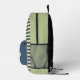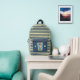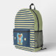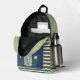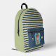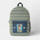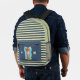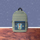 Sac à dos mignon pour les enfants avec un drôle d'ours brun mangeant un énorme cône de crème glacée. Il est composé de 3 couleurs principales (bleu, vert et jaune) dont une motif à rayures à l'avant. Personnalisez avec les initiales de l'enfant. © ArianeC Illustrations-Tous droits réservés