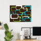 A colorful design of lime green, white and turquoise blue retro inspired squares against a chocolate brown background on a poster