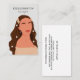 Un carte de visite parfait pour votre coiffeur ou salon de coiffure avec une silhouette d'une femme souriante avec de longs cheveux brun foncé et une peau moyenne, avec des clips de cheveux à fleurs dans ses cheveux.