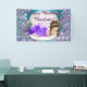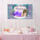 Brunette mermaid bannière de fête d'anniversaire avec adorable brune princesse mermaid petite fille dans une jolie coquille couleur perle avec perles et bijoux sur un bleu violet et turquoise sous l'arrière - plan de mer. Vous pouvez facilement customiser cette jolie bannière d'anniversaire de sirène pour votre événement en ajoutant le texte de votre choix. Il s'agit d'un design imprimé sans véritable parties scintillant, perles, bijoux, etc.