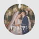 Charmant ornement de Noël pour les jeunes mariés personnalisés avec une photo de chaque côté. M. & Mme est écrit dans un script de brosse audacieux au-dessus de deux flèches pointant vers un coeur dans un regard dessiné à la main.