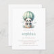 Cette mignonne invitation à la fête de premier anniversaire comporte un panda d'aquarelle douce dans une montgolfière verte à la menthe entourée de nuages et de fleurs roses, au-dessus des mots "veuillez vous joindre à nous pour la première fête d'anniversaire de [nom] !" en caractères italiques marron. Personnalisez-le avec le nom de votre enfant en lettres croisées vert menthe, avec les détails en police sans serif marron sur un arrière - plan blanc. Idéal pour un panda, une aventure, un voyage ou une fête de premier anniversaire avec ballon à air chaud.