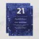 Une invitation moderne, élégante et glamour pour une fête de 21e anniversaire. Un arrière - plan bleu marine, décoré avec de la poussière de parties scintillant imitation. La couleur bleue est inégale. Personnalisez et ajoutez votre nom et les détails de votre fête. Le numéro 21 est écrit avec une police de style ballon, script, couleur argent.